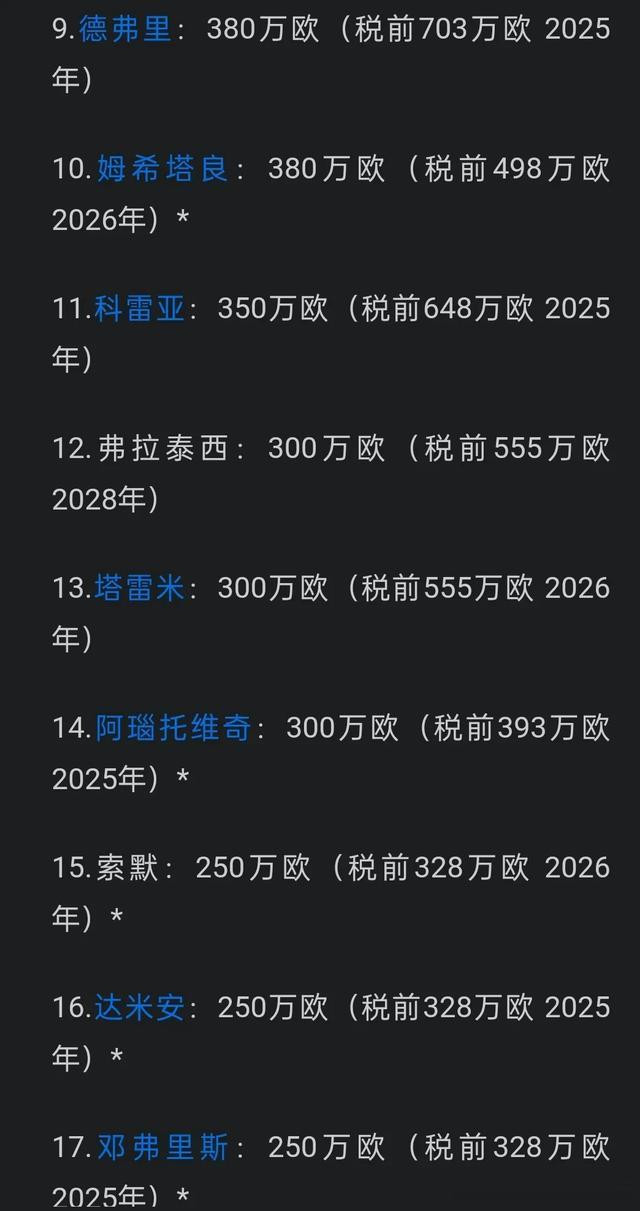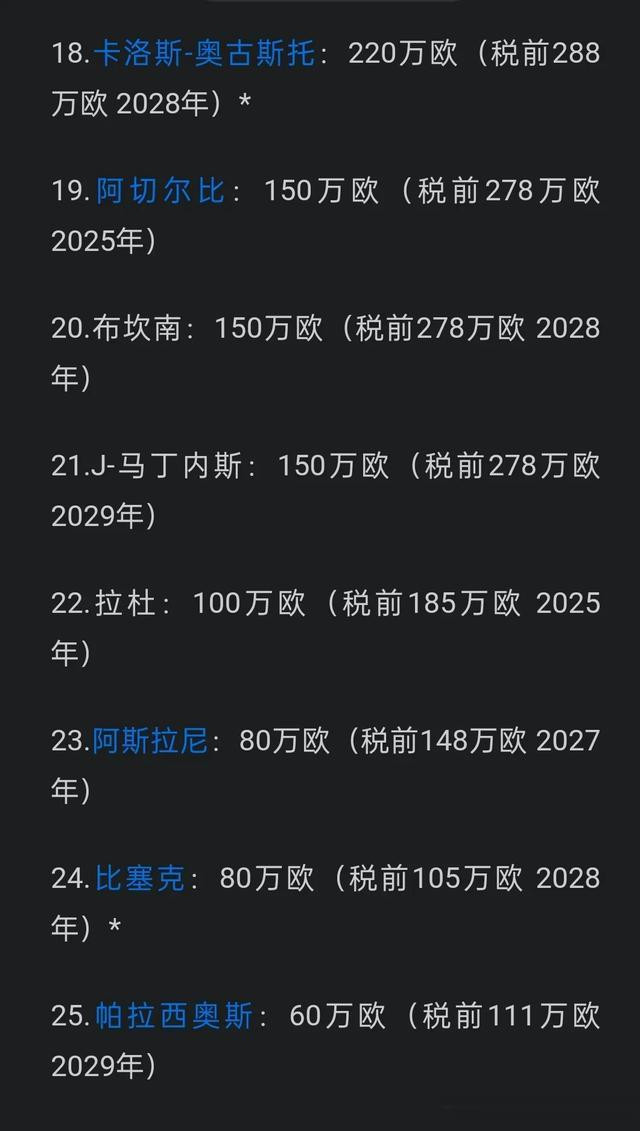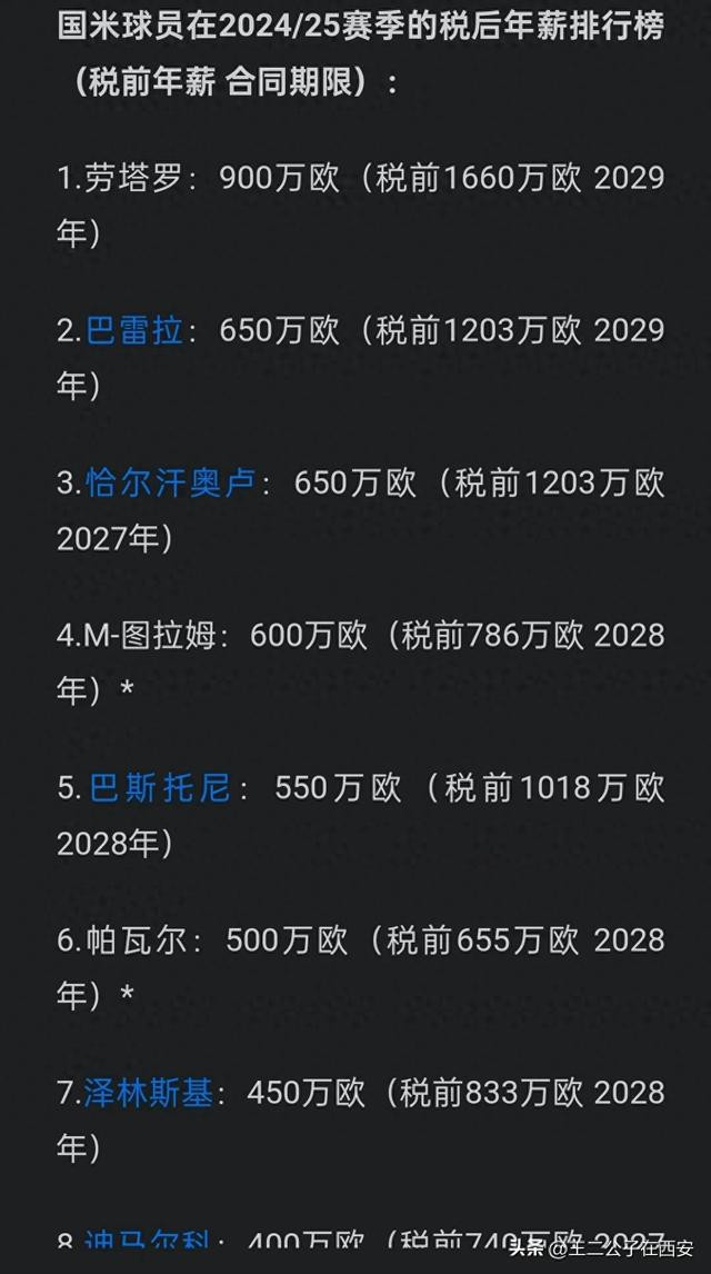查了一下,报谈中的国米一线队球员薪资总数为1.47亿欧,税后薪资为8400万欧。国米薪资排在前12的有劳塔罗,巴雷拉,恰尔汗,图拉姆,巴斯托尼,帕瓦尔,泽林斯基,迪马尔科。