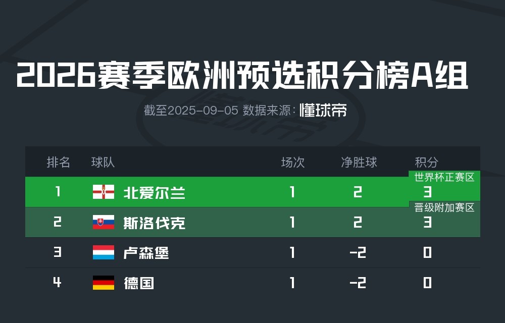 斯洛伐克则是在主场2-0打败德国排在A组第二,卢森堡输给北爱尔兰之后名挨次三。