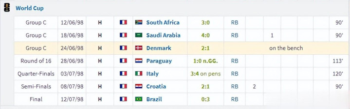 绝不夸张的说,当98年天下杯开启时,图拉姆正处于现象巅峰,成为法国队首发右后卫亦然毫无悬念。除了小组赛末轮对阵丹麦时球队大交替没踢,图拉姆首发踢满了剩余全部比赛。在阻挠端出色的同期,这届杯赛咱们致使看到了一个不同样的图拉姆。小组赛对阵沙特助攻特雷泽盖都只可算是小试牛刀。