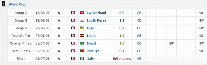 06年天下杯是72一代球星临了一届天下杯,他们大多也都有着不俗证实。这其中当然也包括了图拉姆,大致是都达内的证实过于惊艳,让东谈主们忽略了图拉姆的证实。整届赛事图拉姆踢满了全部每一场比赛,超越德塞利一度成为国度队出场记载第一东谈主。法国队也在一众宿将的添砖加瓦下杀入最终决赛,只不外都达内惊天一顶以及特雷泽盖点球不进让他们的冠军梦最终化为虚无。