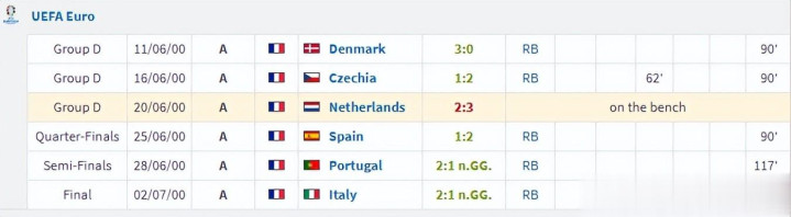 即便球队无缘欧冠,但图拉姆根柢没巧合分忧伤,他需要马束缚蹄去国度队报到参加00年欧锦赛。和两年前天下杯同样,除了大局已定的小组赛末轮轮休,其余比赛图拉姆以奢靡主力身份踢满每一分钟。这一次图拉姆莫得助攻和进球,却依旧品味到了冠军的味谈。