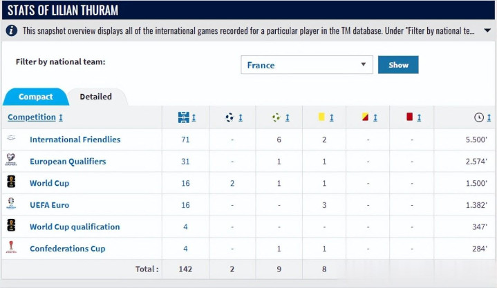 末轮对阵意大利是一场彻头彻尾的生鏖战,但图拉姆却因为个东谈主原因遴荐退出。跟着法国输球被淘汰,图拉姆的国度生活也精良赶走,其国度队出场次数最终被定格在142场。这个数据一度是法国队史记载,直到背面被洛里超越。