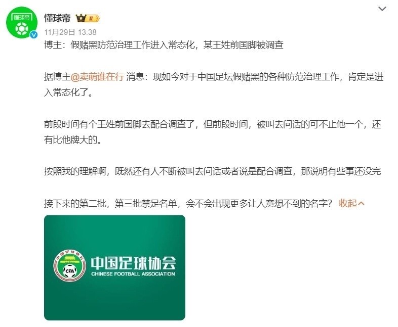 如果从前国足主教授李铁被带走访问算起,那么这场对于中国足坛的反腐行动放胆咫尺也曾捏续了2年多了,况且令球迷们饱读掌的是,如今足坛反腐行动仍在持续,距离咫尺最近的一次重磅新闻,等于2024年9月10日公布的第一批“禁足名单”,首批名单涉案足球从业东说念主员多达61东说念主,其中有43东说念主被罚“毕生谢却在我国从事任何与足球相关行为”,而如今,第二批“禁足名单”似乎左近公布了,据“懂球帝”报说念宣称,一位“王姓前国脚”也曾被叫去合作访问了,况且带走合作访问的还不啻他一东说念主,中间更是有比他还大牌的好意思妙东说念主物,这起音信说明中国足坛反腐行动也曾走进常态化情状,也等于说,第二批第三批“禁足名单”,很快就要驾终末